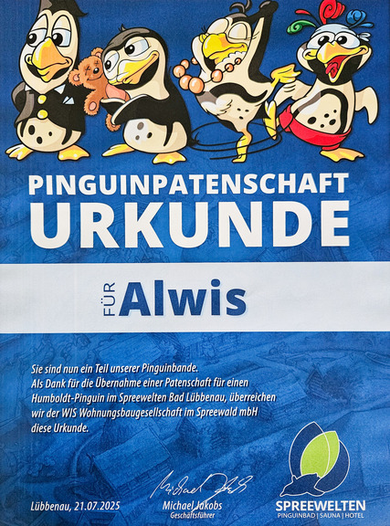 Wir haben die Patenschaft für einen der niedlichen Humbold-Pinguine in den Spreewelten übernommen: Alwis heißt unser Patenpinguin.